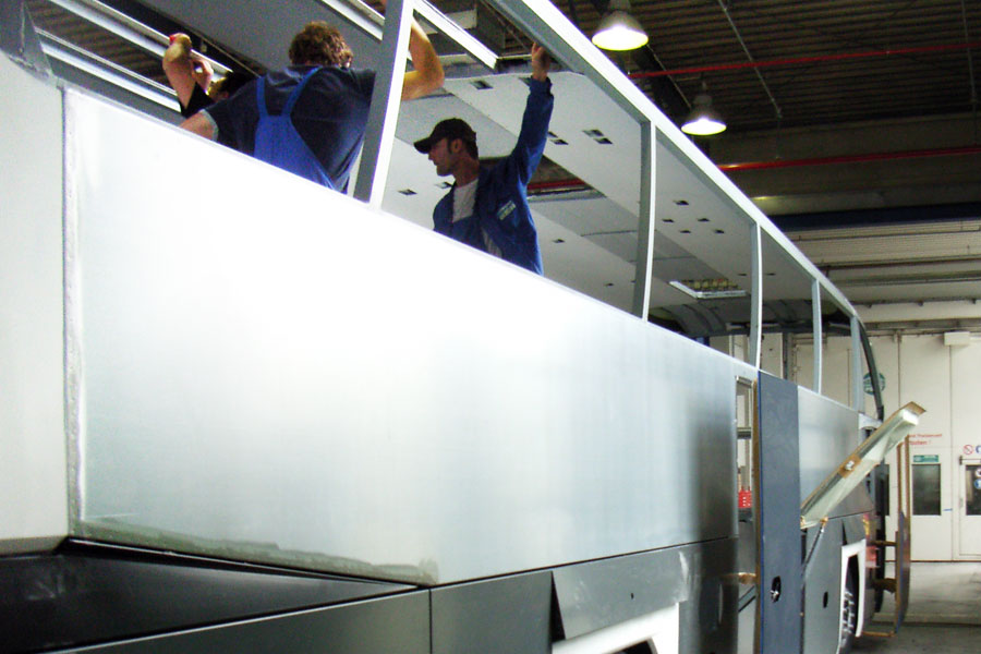 So fertigen wir auf unseren hydraulischen Abkantpressen Karosseriebleche bis 12.5 m Länge für einen der weltweit bedeutendsten Hersteller von Reise-, Stadt- und Überlandbussen.