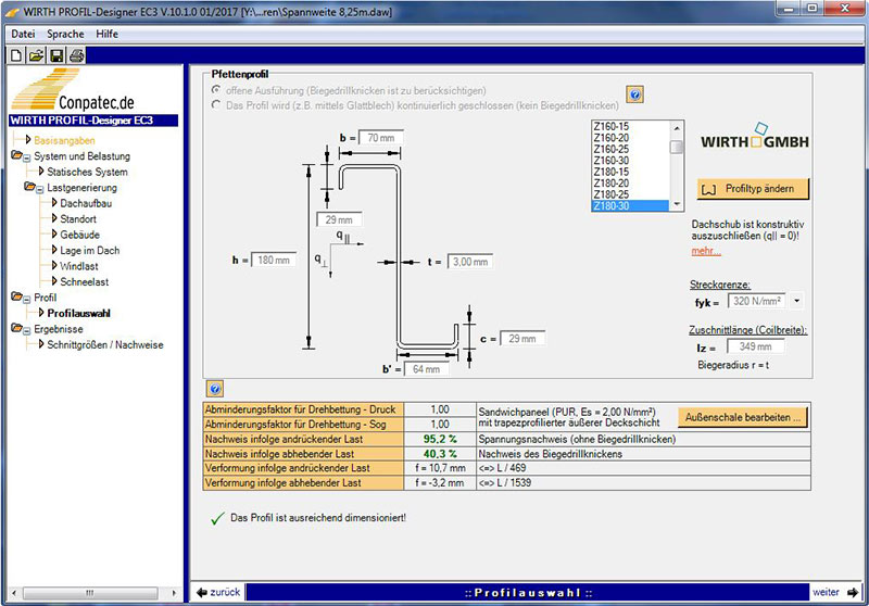 Mit dem Vorbemessungsprogramm WIRTH PROFIL-Designer EC3 realisieren Sie die Vorauswahl der Pfetten und Riegel für Ihr Bauvorhaben schnell und komfortabel nach DIN EN 1993-1-3, Anhang E.