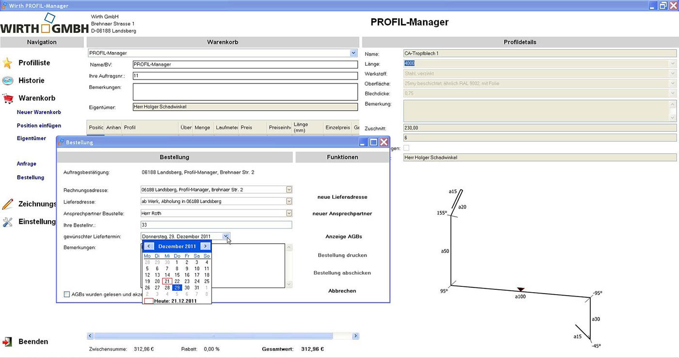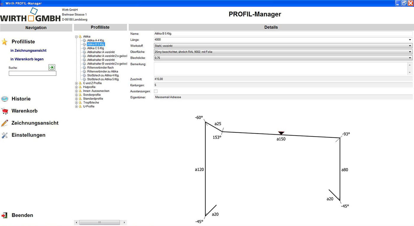 Mit dem WIRTH PROFIL-Manager stellen wir Ihnen die optimale Zeichnungs-, Planungs-, Bestell- und Verwaltungssoftware für Ihre Kant- und Stahlleichtprofile zur Verfügung, mit der Sie Ihre Bestellungen und Auftrags- und Abrechnungsmodalitäten stets im Blick haben.