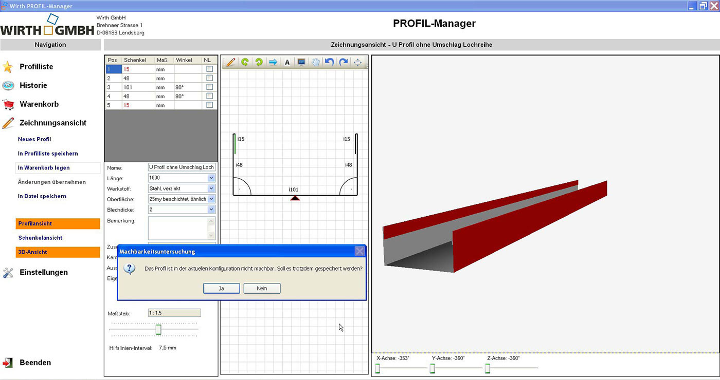 Die integrierte Plausibilitätsprüfung gewährleistet, dass nur hestellbare Profile angefragt bzw. bestellt werden können, für die auch alle zur Produktion notwendigen Angaben vorliegen.
